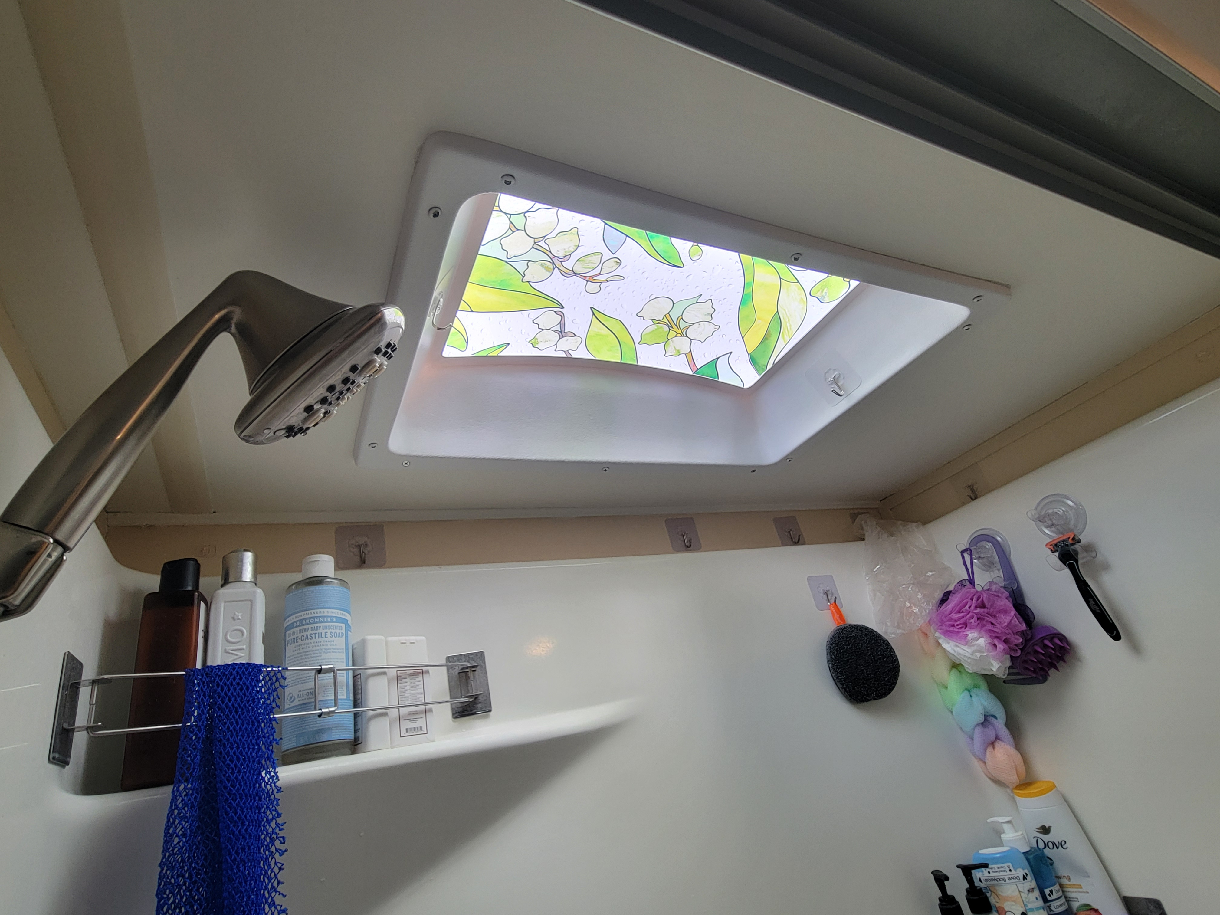 I did not do a ton of work while we were at this spot, I was wanting to rest up for the big road trip to Florida. The main thing I did was replace the interior section of the skylight. The one that was installed was cracked and after the water leak, I wanted to change it out with a new one. The one that had cracked was frosted acrylic so it diffused the light a little but I was only able to find a clear one in the size I needed. I decided to cut out some flowers and leaves from left over window cling to break up how bright the light was. I like how it came out and it seems to be holding up alright so far.